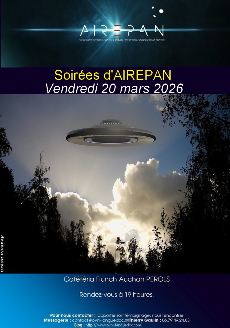 Aucun conférencier n’est prévu cette fois-ci mais nous pourrons échanger librement à bâtons rompus sur le thème des PAN (Phénomènes Aérospatiaux Non identifiés). L’entrée est libre, ouverte à tous, et le rendez-vous est fixé vers 19 heures dans la salle du haut.
